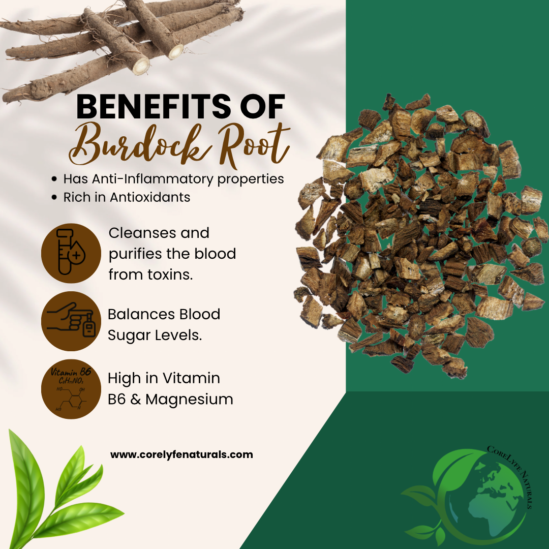 Tea/Infusion: Add 1–2 tsp of dried Burdock Root to hot water and steep for 10–15 minutes. Strain and enjoy up to twice daily.