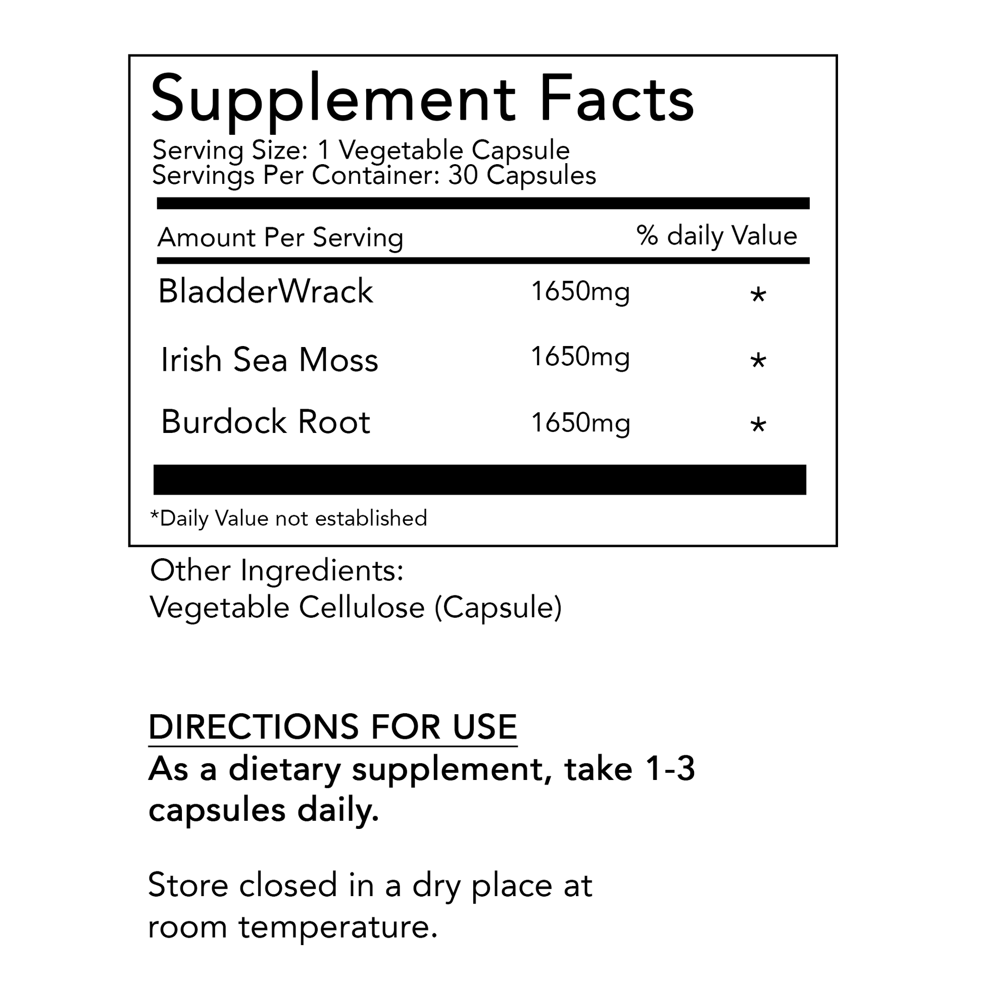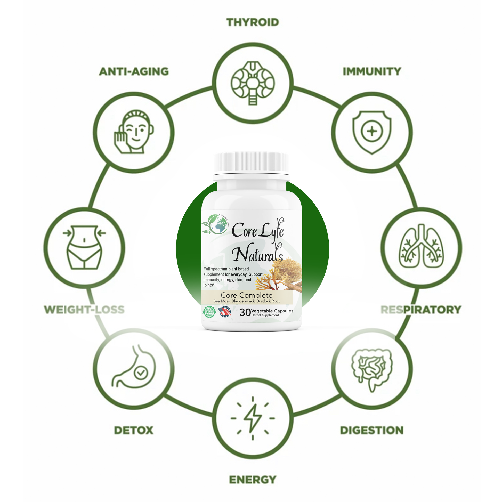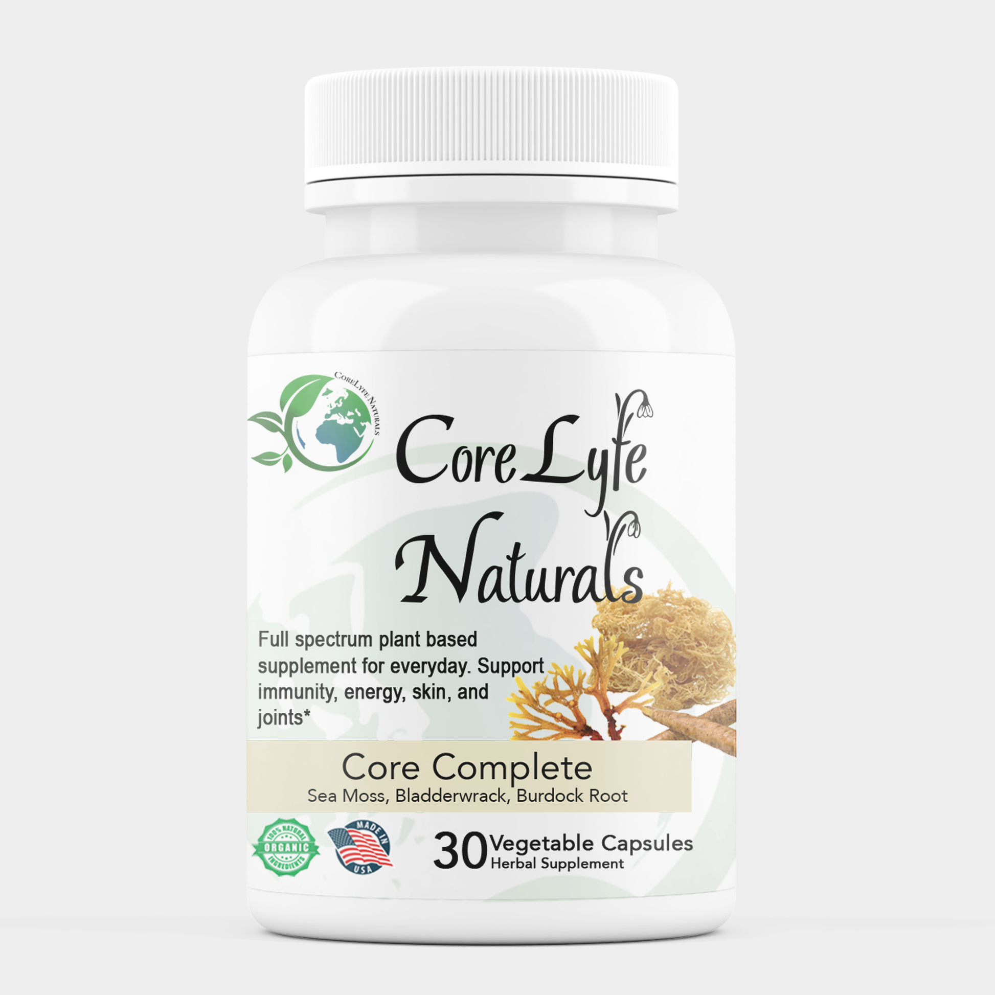Each bottle contains 30 Core Complete (Sea Moss, Bladderwrack, Burdock Root) vegetable capsules and is derived from wildcrafted herbs.
