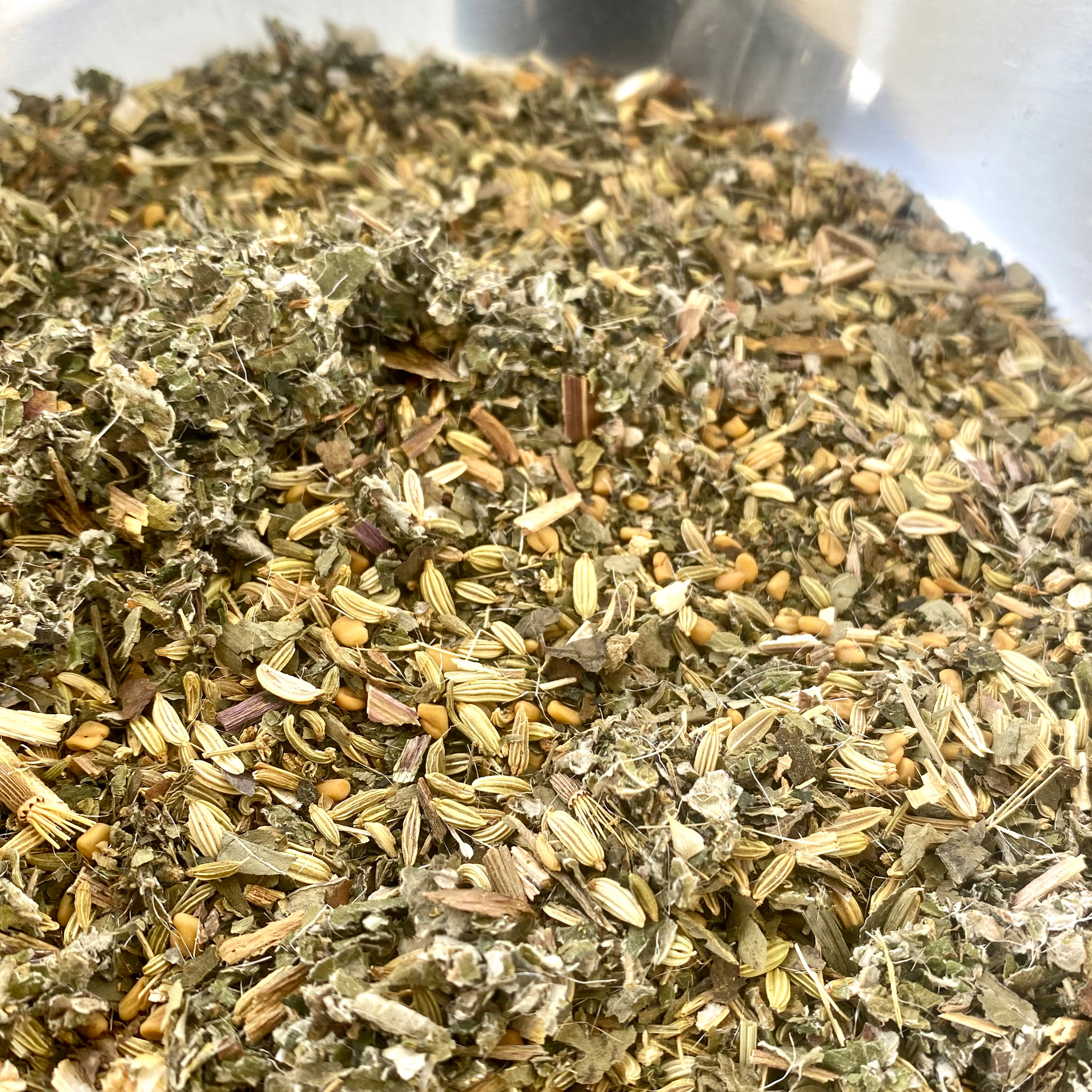 Ingredients: fennel seed whole*, fenugreek seed whole*, red raspberry leaf*, nettle leaf*, dandelion leaf*, blessed thistle*.